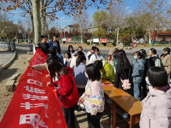 11月28日上午,宣传活动如期开展。社团成员在道路旁张贴预防艾滋宣传标语并悬挂横幅,随后,社团分为3组,分别在员工宿舍楼、食堂南门、超市门口等地方分发宣传单,向路上的同学普及艾滋病相关知识,并通过现场讲解、咨询、有奖问答等多种形式向同学们宣传艾滋病防治知识。特别的是围绕艾滋病,结合营养健康专业知识,对艾滋病患者的科学合理饮食开展专业性宣教。活动结束,全体社员在横幅上签上名字并拍照合影。