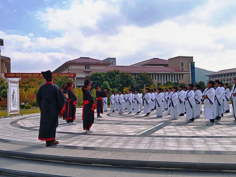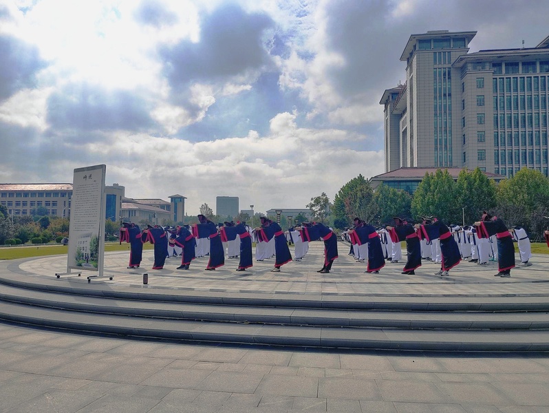 活动现场,古人入学时隆重的“拜师礼”再现。首先,全体师生向先师孔子像行揖礼,员工向教师代表行揖礼。其次,员工献上束脩六礼,教师代表回礼;再次,教师训诫勉励员工,员工明志回应。最后,齐诵经典,朗朗诵读声响彻校园。此次敬师礼复原了古代传统的仪式程序,使师生们直观感受到教师职业的崇高,意识到师道传承的意义,加深了员工对“感念恩师,刻苦学习,成人成才”的认识。