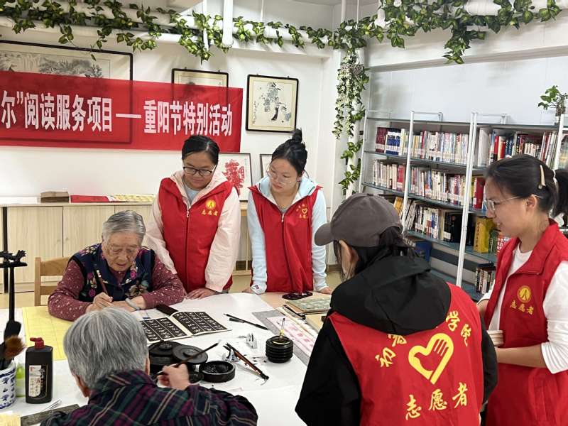 活动开始前,志愿者们积极协助福利中心工作人员布置现场,精心摆放并擦拭了桌椅,整理了图书阅览室,为老人们打造了一个充满温馨、欢乐的重阳节日场景。活动中,志愿者们分工明确,有条不紊地开展着各项活动。有的陪伴老人们聊天,倾听老人们讲述着过去的岁月,仿佛穿越时空,感受着那个时代的酸甜苦辣;有的陪伴老人临摹软笔书法,老人们挥毫泼墨,手法娴熟,创作出一幅幅精美的作品,展示了老年书法爱好者“老有所学、老有所为、老有所乐”的精神面貌,现场气氛热烈融洽。