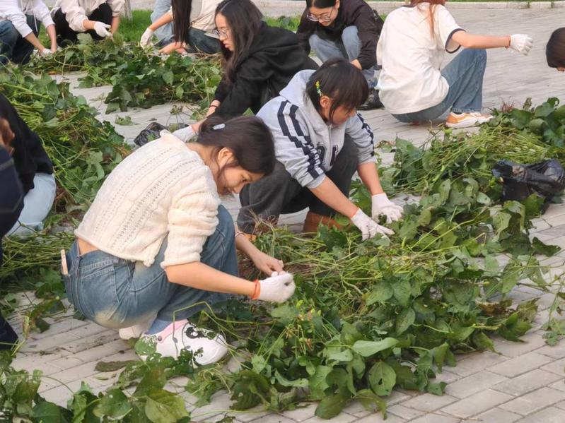 当天下午,党团工作站的成员们齐聚耕读园。在指导教师王英的讲解下,同学们学习了如何采摘毛豆、为山芋翻土等劳作知识。在观看示范之后,同学们跃跃欲试,带好手套,领取劳动工具,分成了若干小组,小组内分工协作,有的捡石头,有的深挖沟,有的高起垄,有的摘毛豆……耕读园的劳动气氛热闹非凡。烈日下,同学们脸被晒得通红,不怕累,不怕脏,汗水和着泥土的芬芳,青春蓬勃的面容上洋溢着劳动的喜悦和满足。