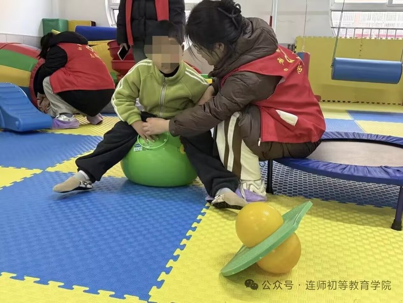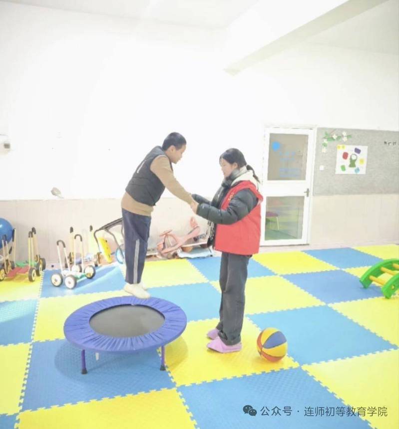 活动现场,志愿者们结合师范生专业特长,设计了多维互动训练环节。在感统训练区,志愿者们耐心搀扶孩子进行蹦床跳跃练习,协助推滚大龙球开展肢体协调训练,全程守护孩子们攀爬软体器材,循序渐进地引导孩子突破自我。在创意互动环节,志愿者与孩子们围坐在一起,共同完成绘画创作与手工制作,在轻声交流中倾听孩子的心声,用真诚与包容搭建起沟通的桥梁。此外,志愿者们还主动承担起照料孩子饮水、整理活动用品等工作,以认真细致的关爱行动保障活动顺利开展。